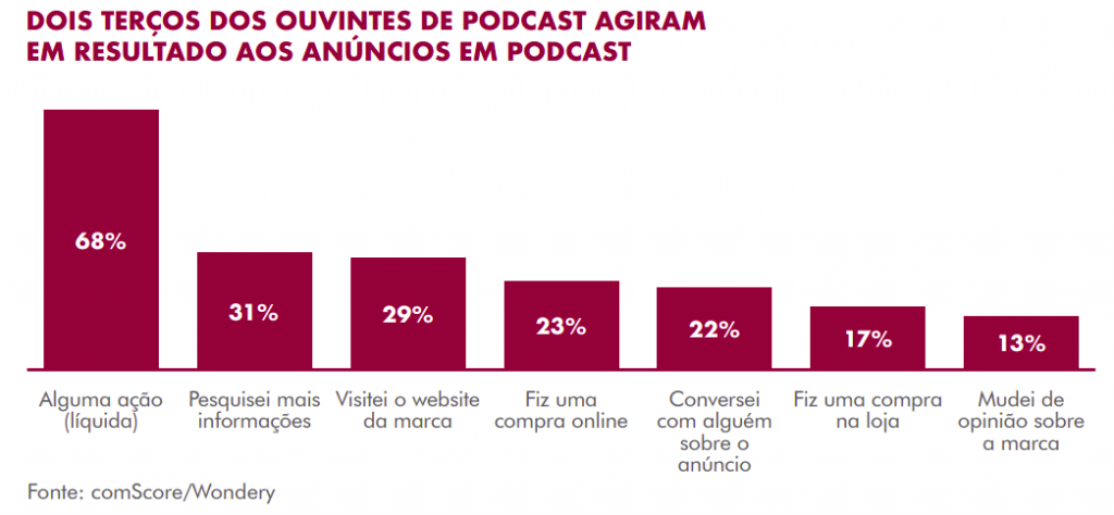 Com o formato em alta, as marcas estão cada vez mais atentas na inclusão de anúncios de áudio no planejamento de mídia. De acordo com a IAB Brasil e Nielsen, em abril de 2020, somente 4% dos anunciantes tinham a pretensão de ampliar os investimentos em streaming, áudios e podcasts ao longo do ano. Já a edição de dezembro de 2020 apresentou um crescimento expressivo, onde 23% dos entrevistados citaram que querem fazer essa ampliação de investimento em 2021.